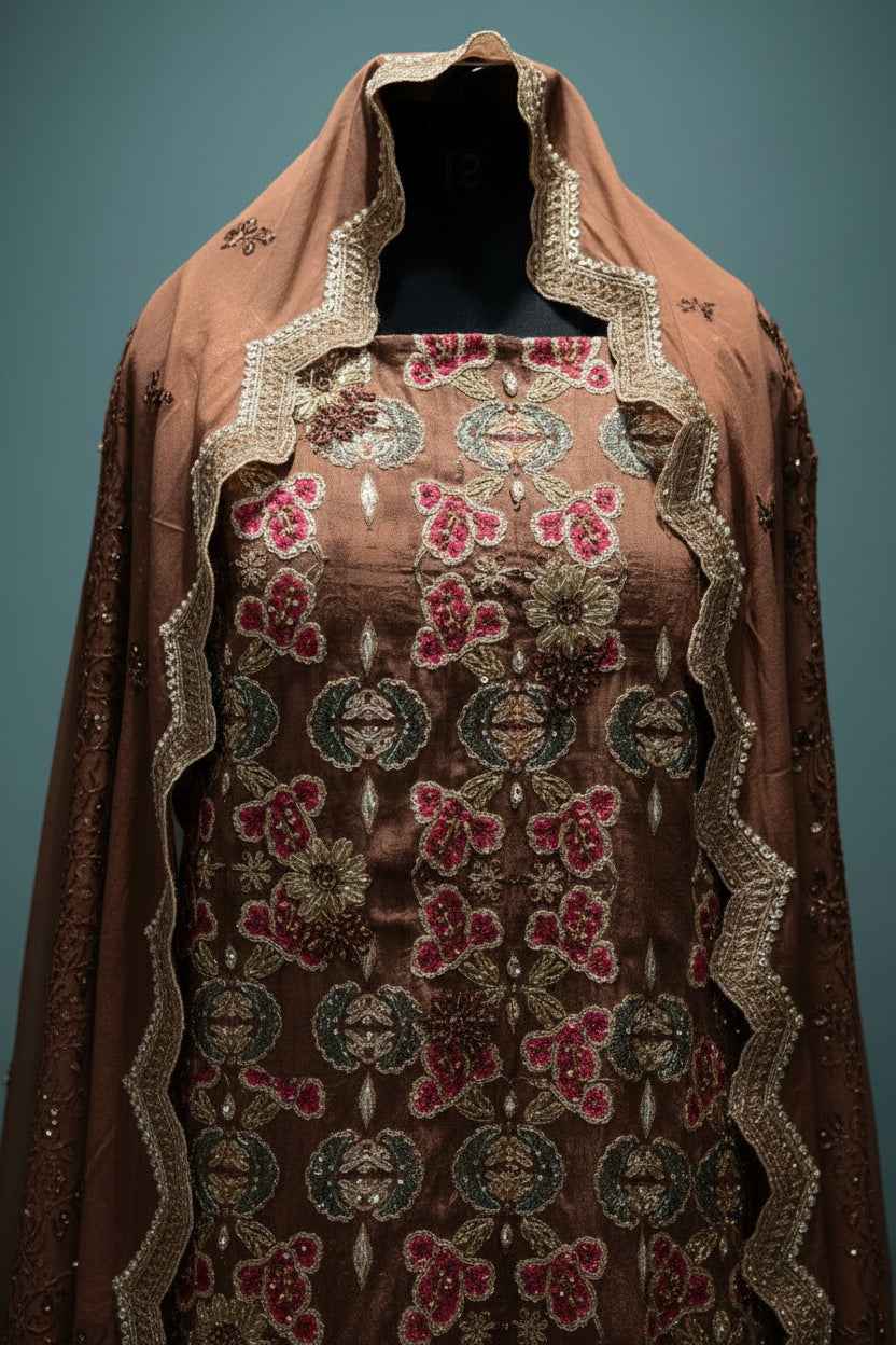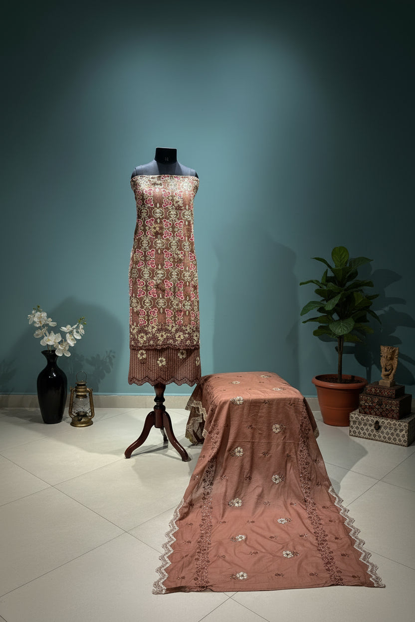This pure cotton unstitched salwar set features an intricate embroidered floral design, enhancing both aesthetic appeal and comfort. Available in blue and brown, this fabric offers versatility for various occasions. The breathable material promotes ease of movement, making it suitable for warm weather.