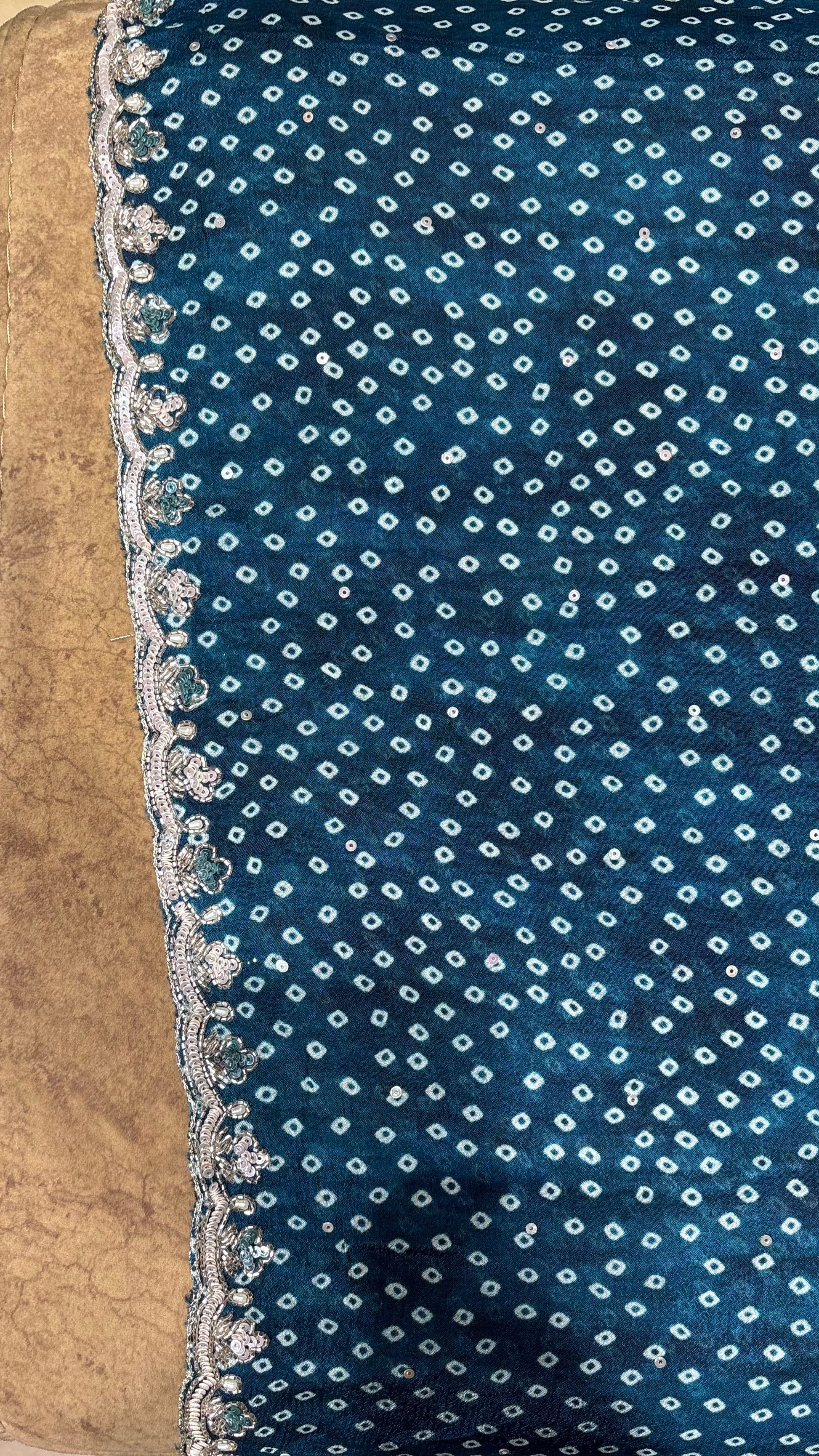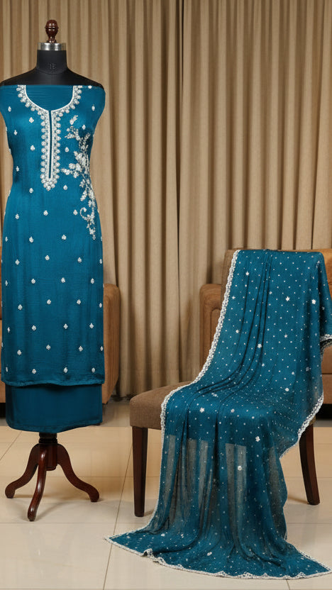 This teal blue unstitched suit material features intricate floral thread embroidery with sequin accents on the neckline, enhancing its aesthetic appeal. The accompanying dupatta is printed and adorned with decorative edging. Composed of Chinon fabric, it can be customized to fit personal style and size, making it suitable for festive occasions and semi-formal events.